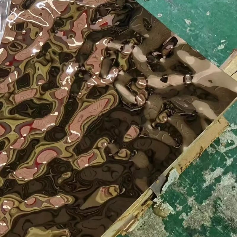 건축 및 인테리어 디자인에 적합한 다양한 색상과 마감으로 제공되는 고급 장식용 스테인리스 스틸 시트로 우아한 물결 무늬가 특징입니다.
